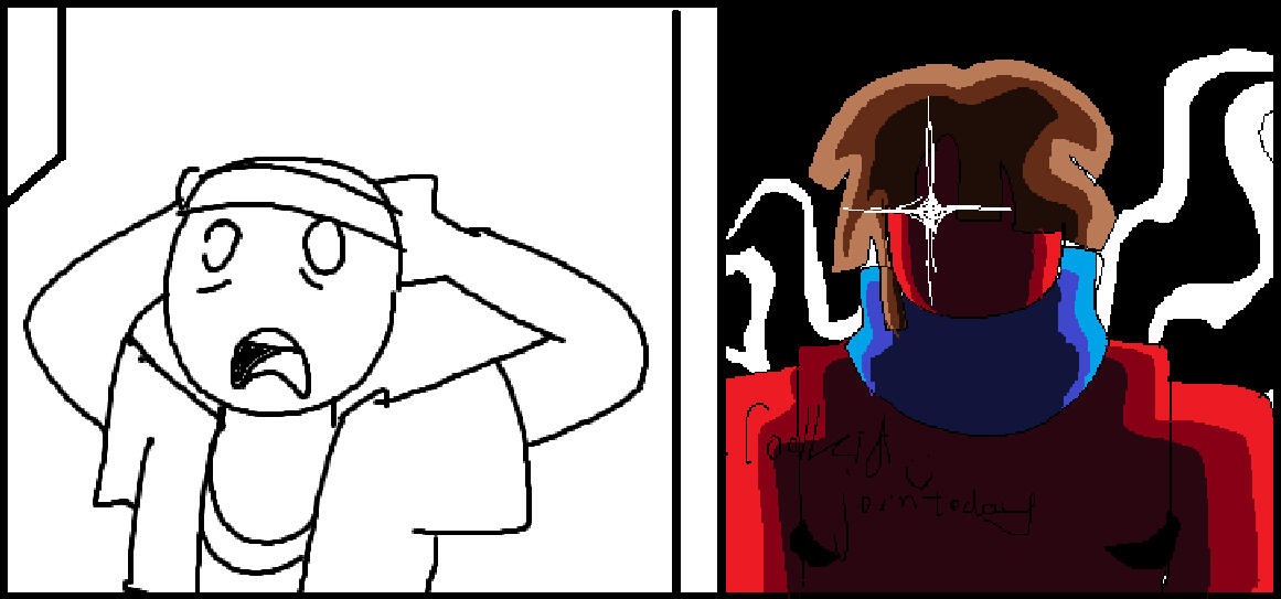 Funny art my friend made when we met a c00lkid cosplayer (while wearing bacon hair)